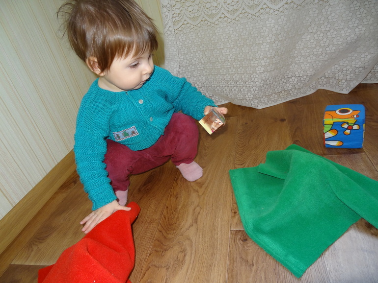 Строили башенки,а потом их накрывали красной и зеленой тканью,сравнивали,но Саша с удовольствием искала башни под тканью)))Еще отмечу,Саша уже умеет башенки строить,вот буквально пару дней "как умеет" это делать,а то все рушила их)))