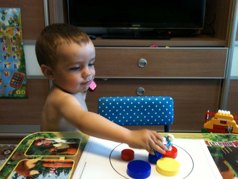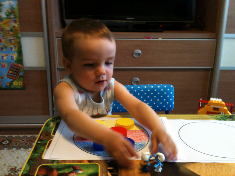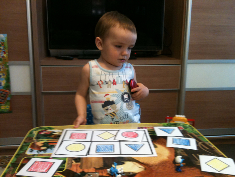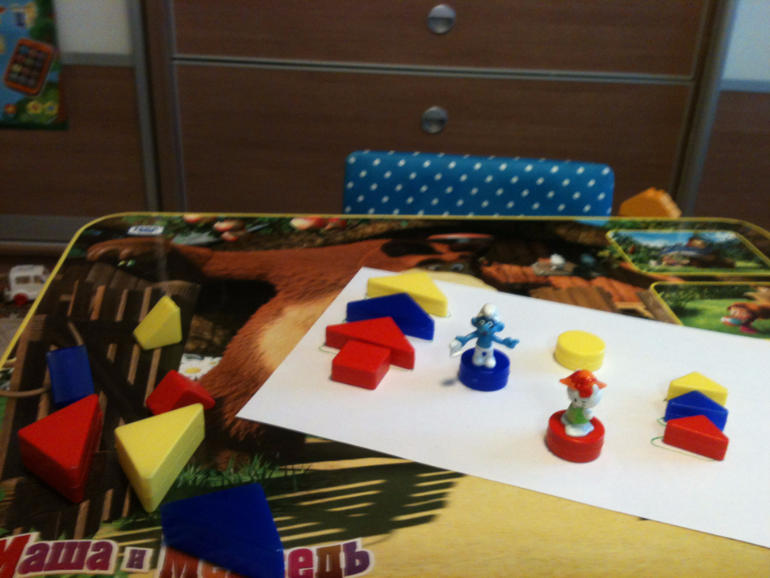 Главными героями у нас были смурфики и им уже сынуля помогал бродить по стране с геометрическими фигурами. Фигуры разложил с удовольствием.