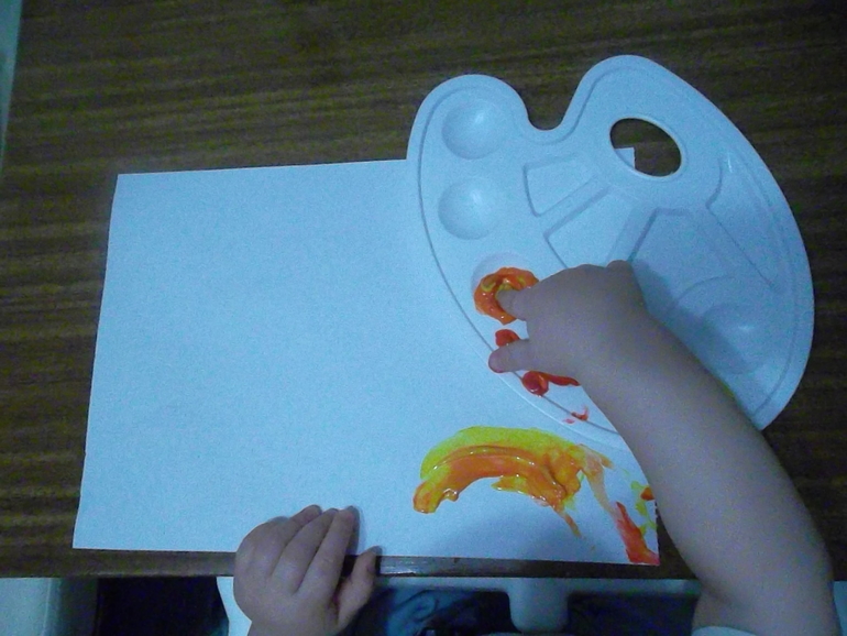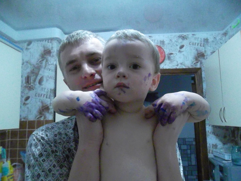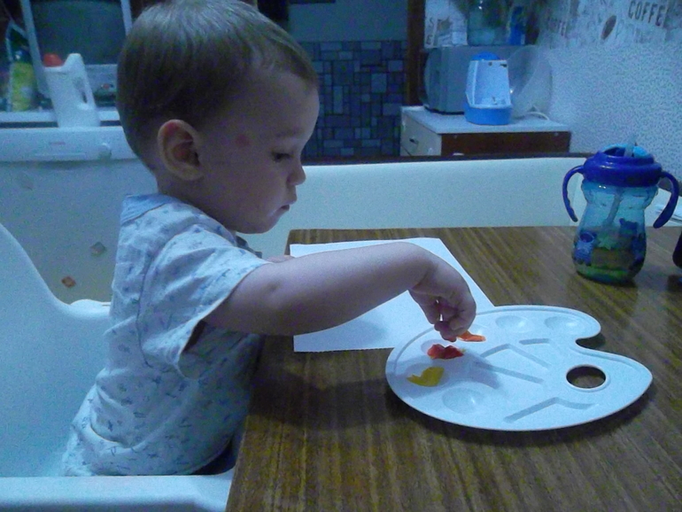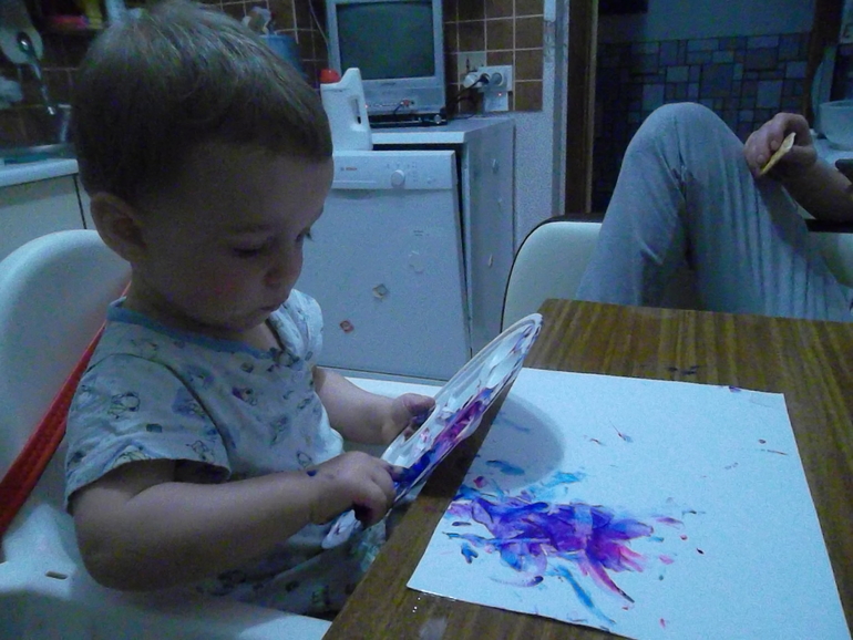 У меня идея фикс по поводу творчества после того, как я прочитала книгу Джин Ван'т Хал "Творческое воспитание". Не хочу лишать ребенка важной составляющей детства, тем более что он не попадет в творческую среду (дома у нас никто не рисует и не лепит). Сейчас мы по большей части исследуем материалы: краски, пластилин, фломастеры, мелки... Это очень важный этап творческого развития: ребенку не менее важно исследовать материалы, а сюжетный рисунок в таком возрасте ему не важен, а важен только для мамы.