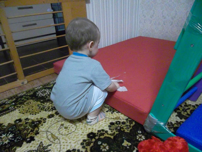 Обычно мы едим с боем, поэтому под конец приема пищи у Кирилла во рту обязательно будет еда, которую он не хочет глотать, и это удобно, потому что он проявляет к материалам для творчества гастрономический интерес. А так пока он вспомнит, что у него каша во рту, пока проглотит ее, уже ползанятия проходит.