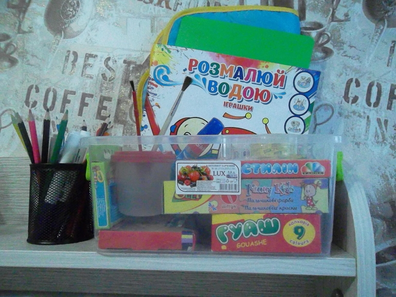 2. Все материалы для творчества я сложила в контейнер, который хранится на полочке над столом. Теперь не надо бегать по всей квартире и искать то альбом, то пластилин. И ребенок знает, где все материалы хранятся и обычно после еды показывает на них пальчиком и говорит "У!".