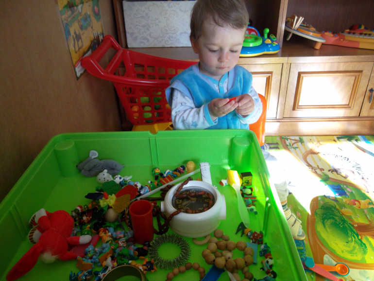 Вот такую сенсорную коробку я готовила к ТН Ферма, которую все никак не проведу. Но коробка не дожила: к нам пришли гости с дочкой, и они вдвоем с Кирюшей ее раздеребанили.