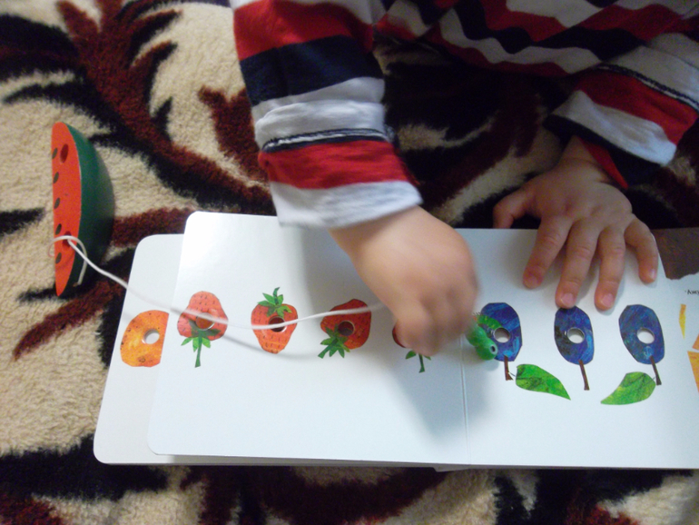 Кормим голодную гусеницу. Правда, потом Кирилл ее сам чуть не съел.
