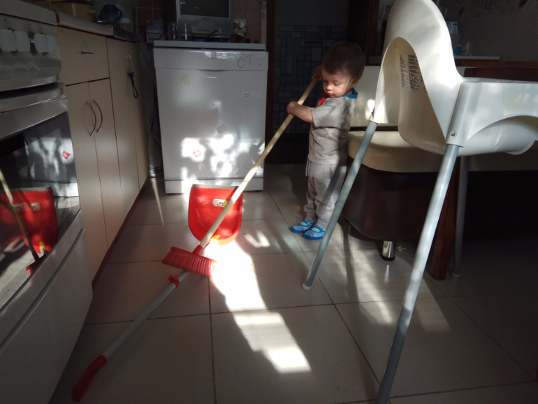 Кирюша помогает подметать. Я после обеда подметала пол, куда Кирюша накрошил хлеба. Он отобрал у меня веник, подметал, потом нагнулся и засунул в рот кусок хлеба