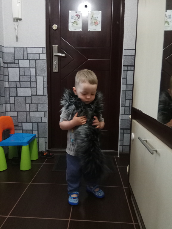Есть у меня воротник от куртки, мы его называем "котиком". Кирюша, погладь котика) Еще он одевает на себя "котика" и смотрится в зеркало. Вообще бегает смотреться, то в панамке, то бабушка венок ему одевала, такой задавака))