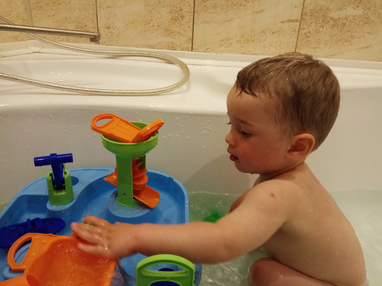 Уже сто лет не купались в большой ванной. У Кирилла море эмоций. Правда, по переливаний-вылавливаний и водного столика он еще не дорос, ему все интересно плюхаться