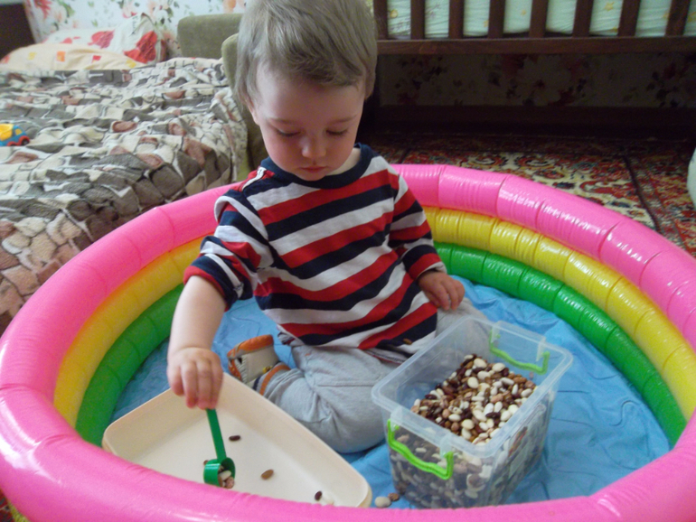 Традиционные игры с фасолью. А вот тут я стала замечать, что он уже не сразу все высыпает, а может и ложкой попересыпать, а потом внутрь запустить руки и порелаксировать. Но под конец все равно высыпает, куда ж без этого. Только бассейн и спасает комнату от фасолевого наводнения, а меня от часа уборки.