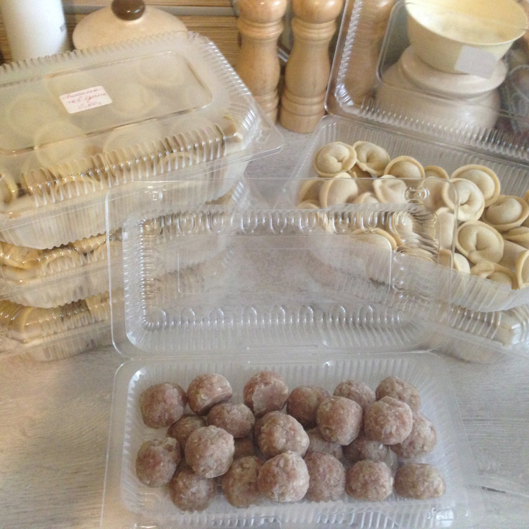 Пельмешки, фрикадельки, а в мешочках спрятались замороженные манты)