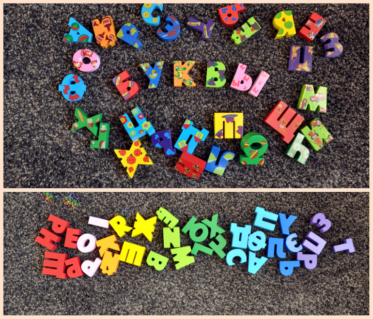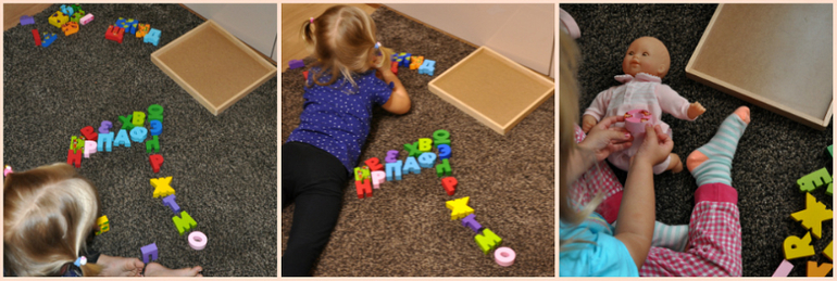 Кстати, Василиса часто играет с буковками, как с игрушкой: строит башенки, мосты, варит в кастрюле из них суп или кашу, или просто кормит своих кукол.