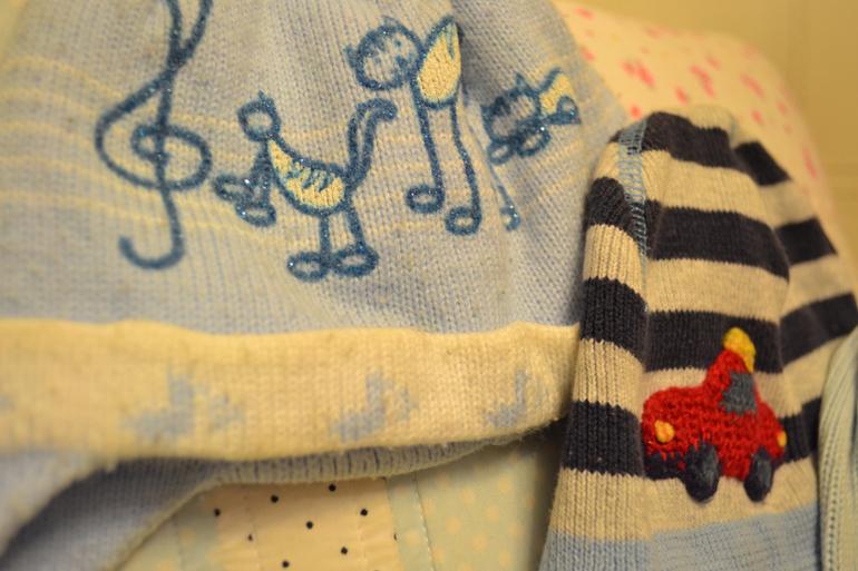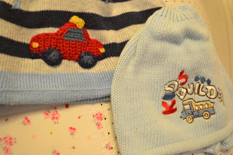 Голубая с грузовиком - 40 см. В полоску - 42 см. С кошками 46 см. Мерила приложив линейку, не натягивая. Ярлычков с указанием размера на шапочках к сожалению нет.