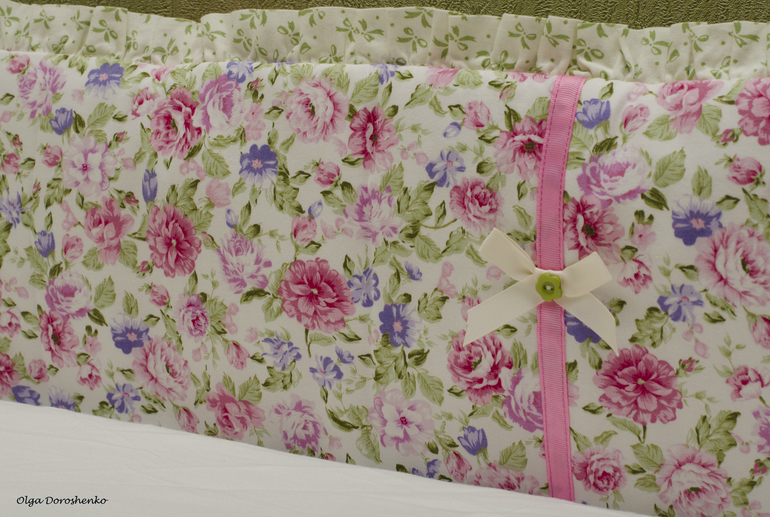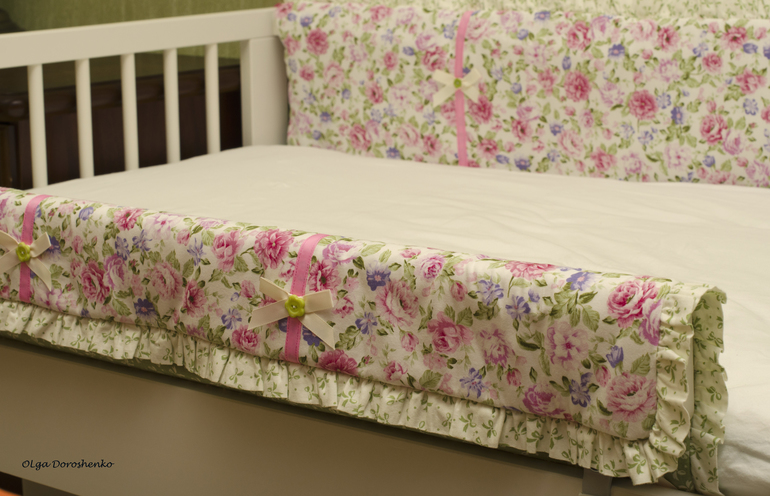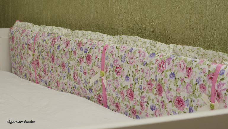 А это общий вид борта на заднюю стенку. Вживую ткань более приглушенная, но никак не удалось ее нормально заснять. Еще планирую сшить бортик к той стороне, где лежит подушка и парочку комплектов постельного белья. К сожалению, ткани у продавца в нужном количестве не оказалось, поэтому жду новую партию и тогда продолжу свое ночное шитье. А пока есть время, чтобы показать;)))
