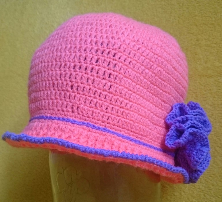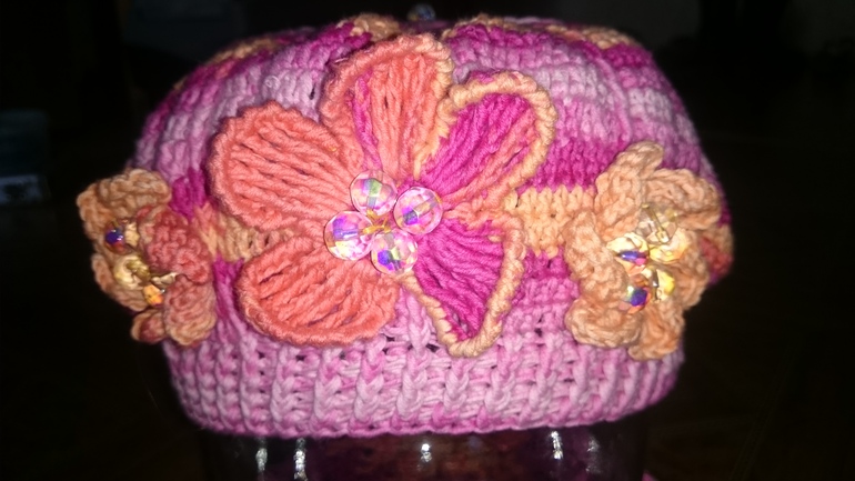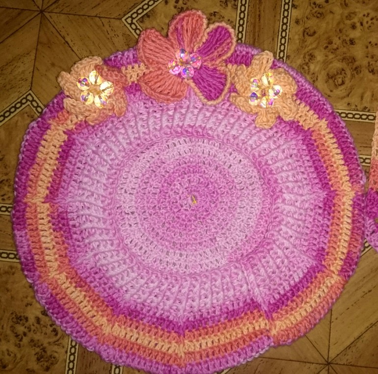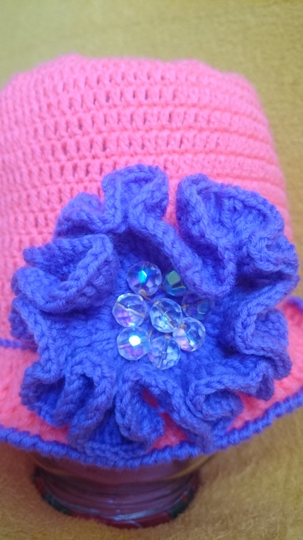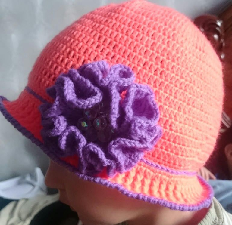2. Шапочка выполнена из акрила. На 2-3 года. Ярко-оранжевого цвета (на фото почему-то бледная..) с сиреневым цветком. 500р.
