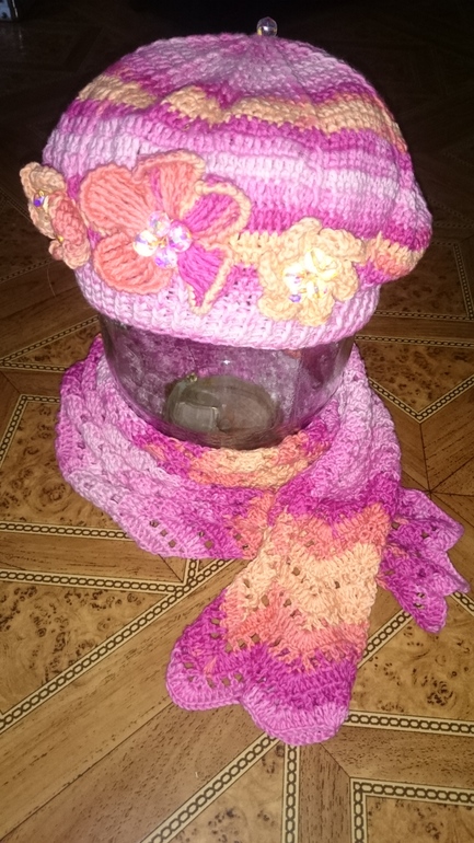1. Комплект выполнен из толстенького хлопка, на 4-5 лет. Длина шарфика 130 см. 1000р.