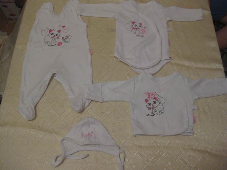 1.Трикотажный комплект из 5 предметов для новорожденного(шапочка,боди,комбинезон,кофточка,,царапки)-цена350 рублей