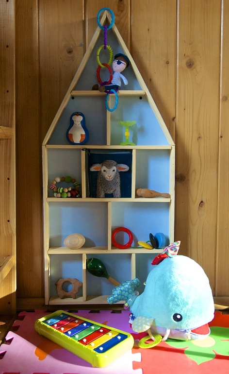 1. Мобиль. Отрезанный от мобиля пират сидит на вершине домика. Мобиль, конечно, был хитом первые 4 месяца. Мы выбирали тот, который потом можно будет использовать в играх, и остановились на Пирате из mamas&papas. Понравилось, что механическая музыкальная часть легко отделяется от игрушки, на ней можно тренировать моторику - учиться заводить. И сами игрушки хороши - пират, попугай, звезда и рыбка. Теперь пират периодически носится Костей из комнаты в комнату. А музыкальную шкатулку мы возили в длительные путешествия, ее мелодию Костя узнает и недавно попробовал завести ее сам. Не получается пока. Но вещь приятная. Вообще, на мой вкус, хорошие мобили нужно искать. Вот были в mamas&papas, теперь там, судя по интернет-магазину, меньше выбор. Из относительно недорогих я видела деревянные мобили у Вальда и s-mala.