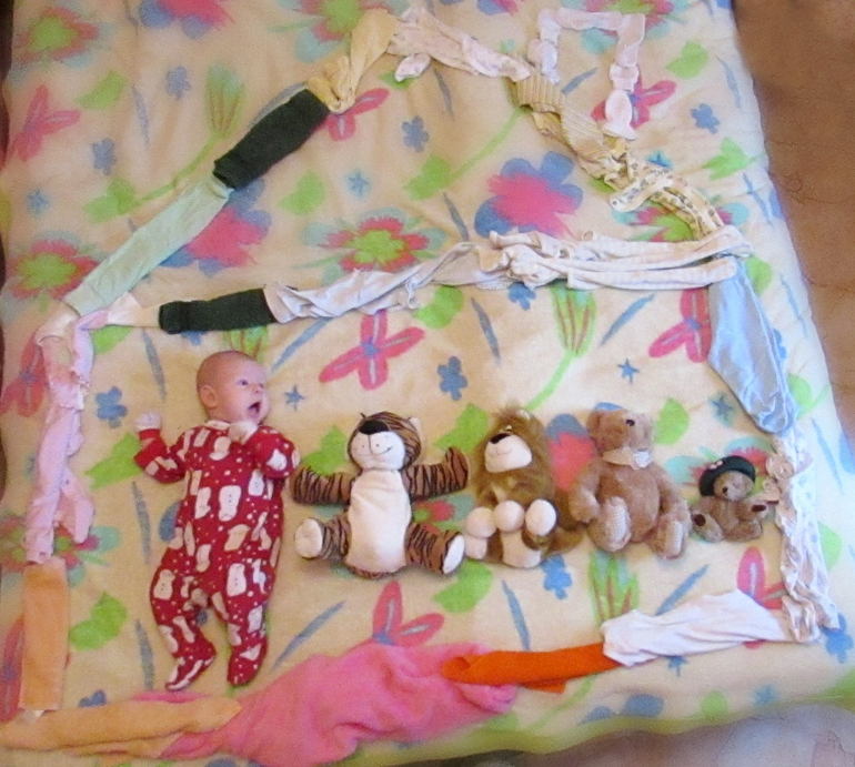 Когда хорошее настроение может долго находится одна,то в кроватке когда смотрит на мобиль,то на "умном" коврике, в основном в утреннее и дневное время. Вечером хандрим перед купанием, после купания тоже иногда,но потом отключается около 23-12 часов ночи и это несомненно меня радует. Папка наш уезжает на следующей неделе в на 5 дней,даже боюсь представить как мы без него будем(( мама конечно моя под боком, но она скорее как второй ребенок,чем реальная помощь(( ох-ох, ну как-то справимся надеюсь...