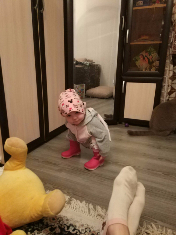 сама любит одеваться ,причем одевает ботинки правильно))Шапку,штаны,ковту..и идет стучать в дверь...типа пора гулять))