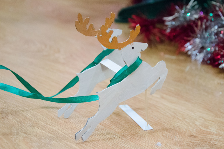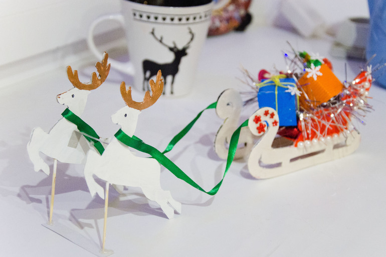 Ну а теперь об оленях). Вообще я собиралась вырезать оленей, чтобы подвесить их на люстру, но у подруги увидела замечательную идею с санками. Решили воплотить свою.