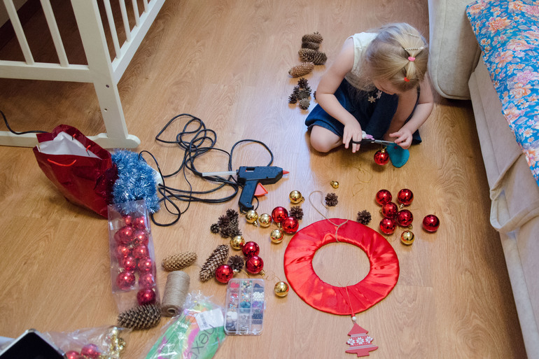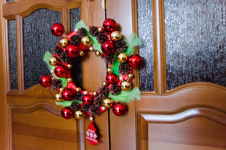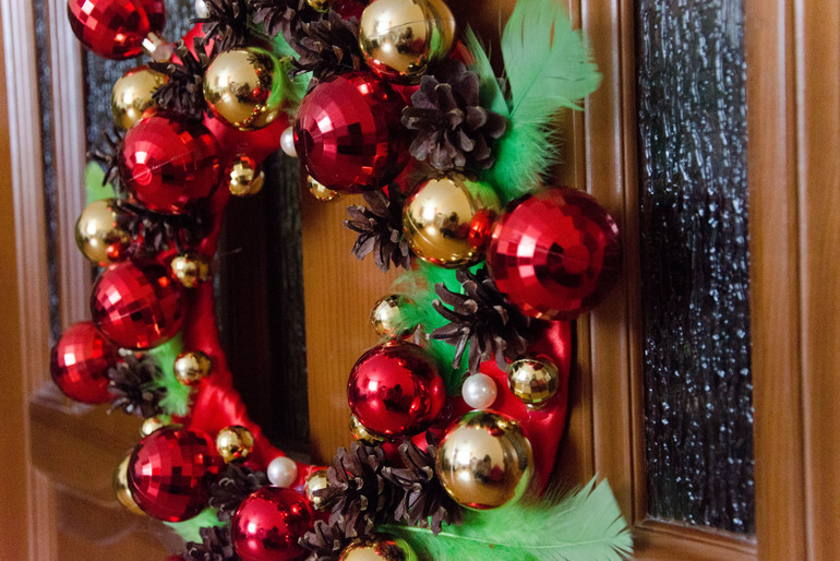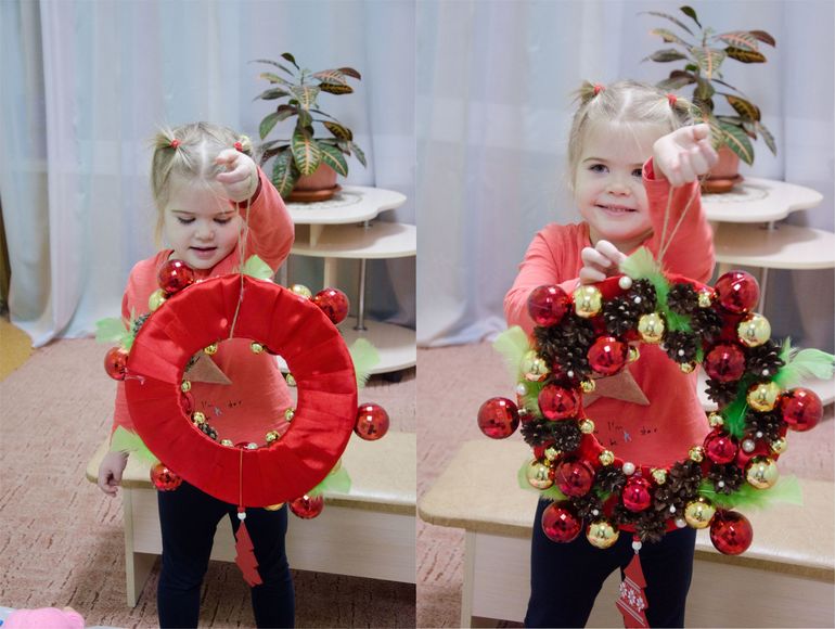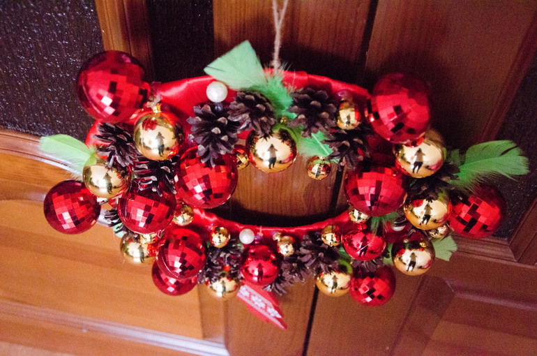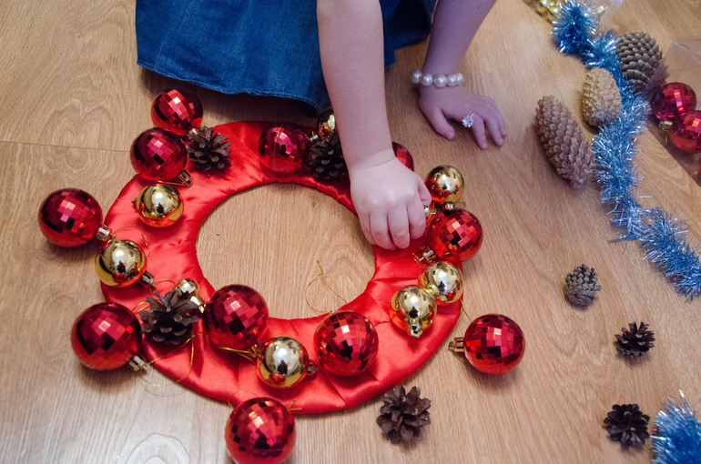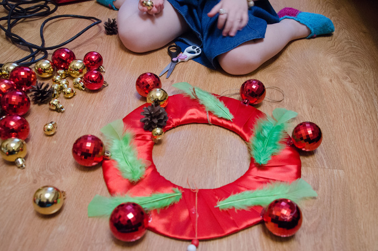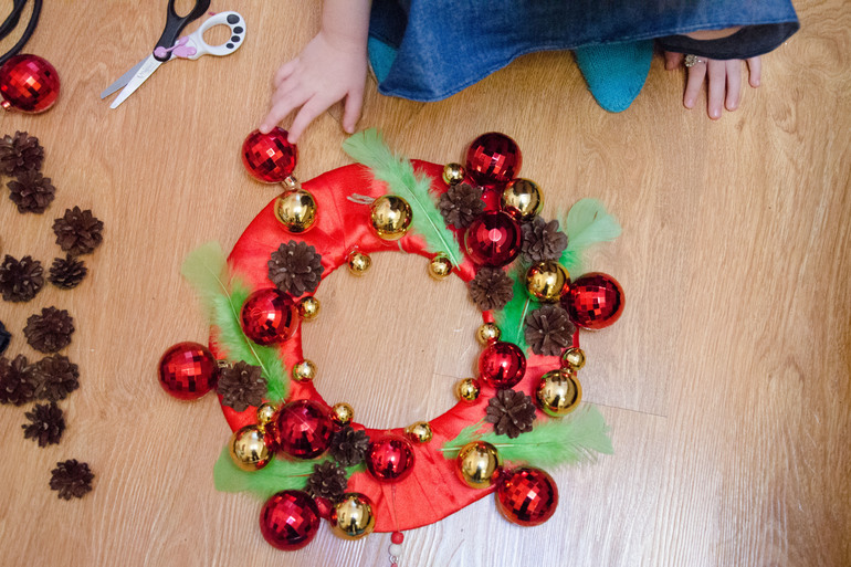 Начнем с рождественского венка. В интернете миллион вариантов, как его сделать. Мы свой слепили из того, что было - картон, лента, елочные шарики, шишки, перышки, бусинки.. Помог наш друг термопистолет. Правда пока делали, у нас дома такой бардак был)))