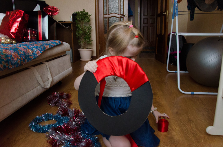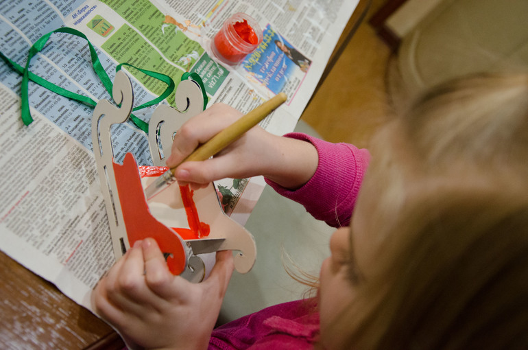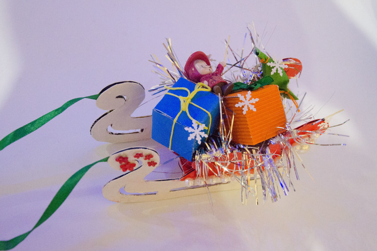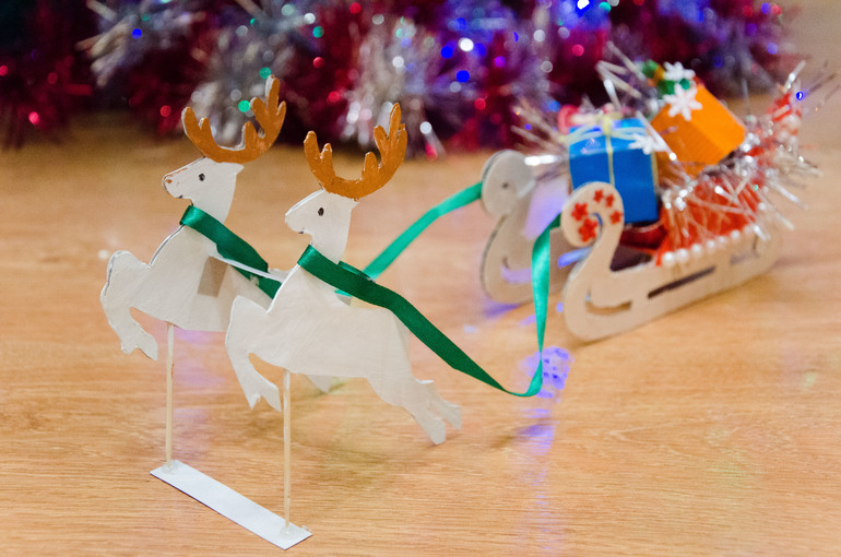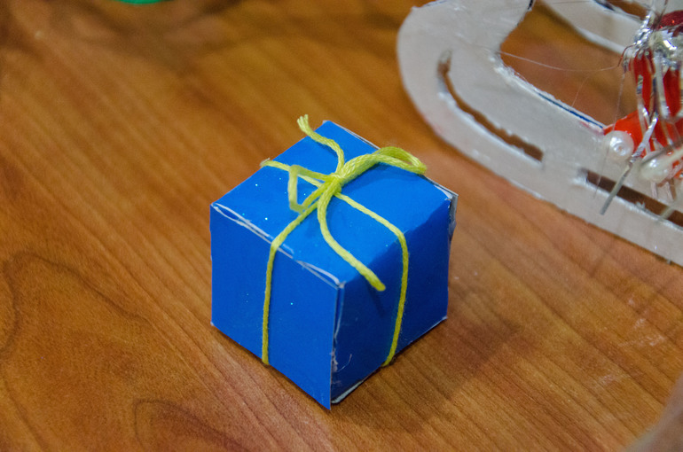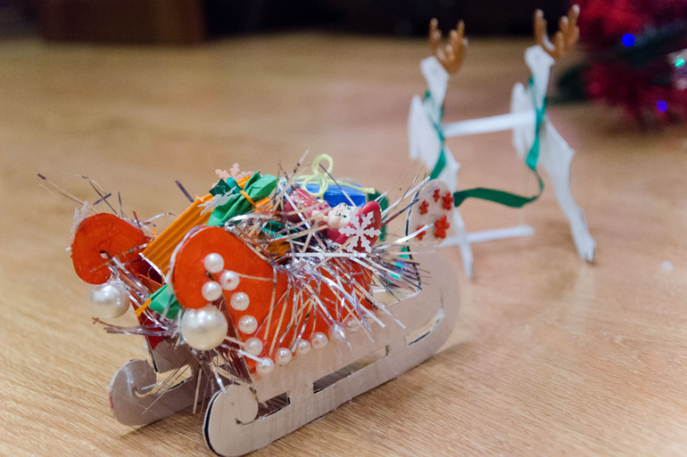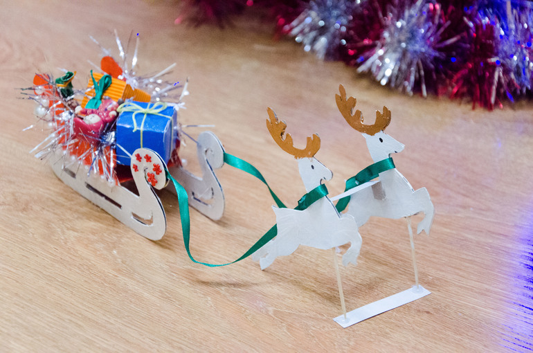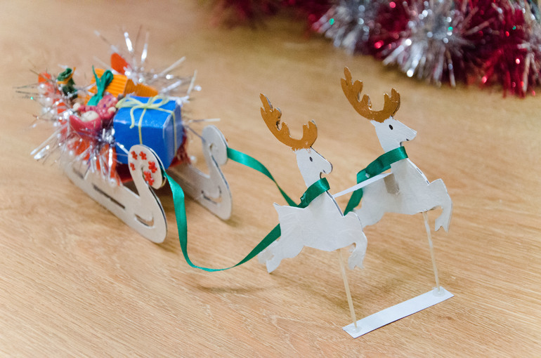 Сани нужно наполнить подарками. Можно положить и конфеты, и картонные самоделки.. мы даже игрушку из киндера положили, которую Насте не жалко)