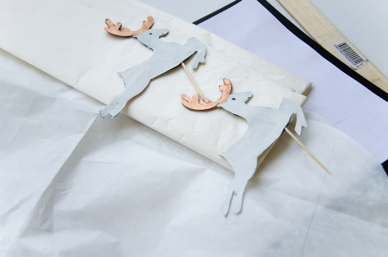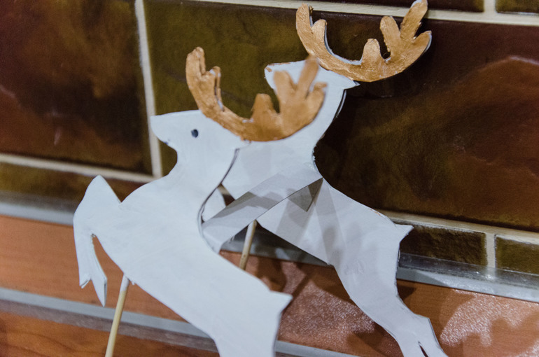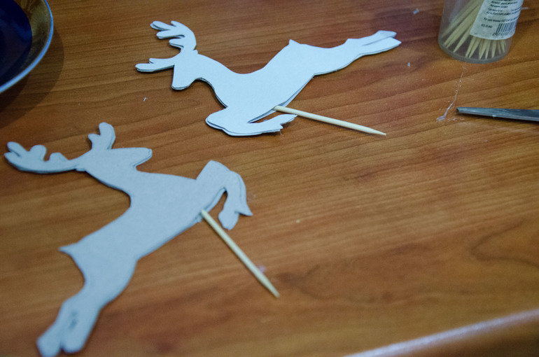 Собираем поделку. Между оленями наклеиваем тонкую картонную перемычку. Картонная перемычка может понадобиться и внизу зубочисток - для устойчивости оленей. Ну все дело в том, что я выбрала не тот шаблон оленей. Если выбрать устойчивый - никаких вообще подставок не понадобится. Но мне уж очень эти бегущие олени понравились!.