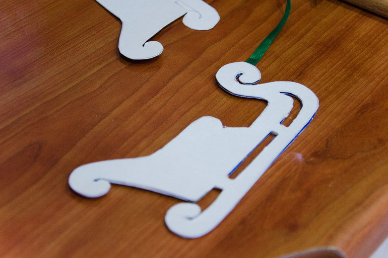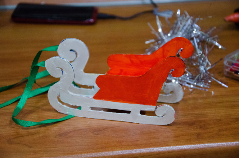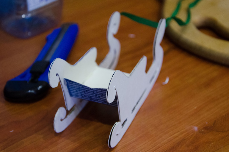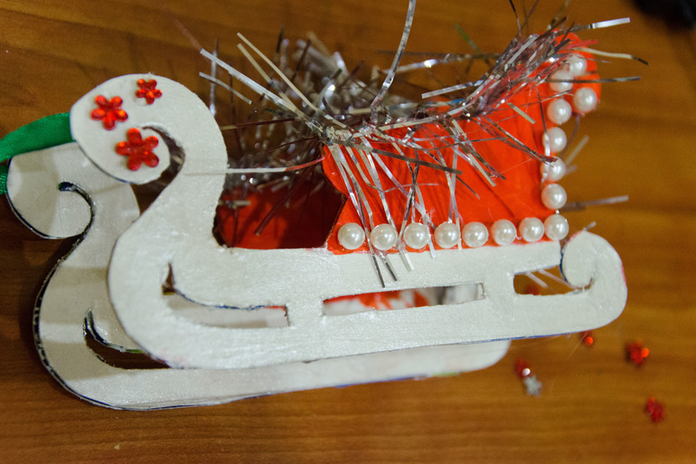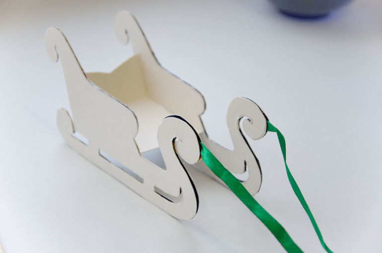 С санками та же история, что и с оленями - выбираем картинку, которая нам нравится, сводим, делаем шаблон, вырезаем. Обязательно используем плотный картон. Я снова сделала каждую часть из двух половинок. Заодно заложила ленточку, которая будет служить поводьями оленям.