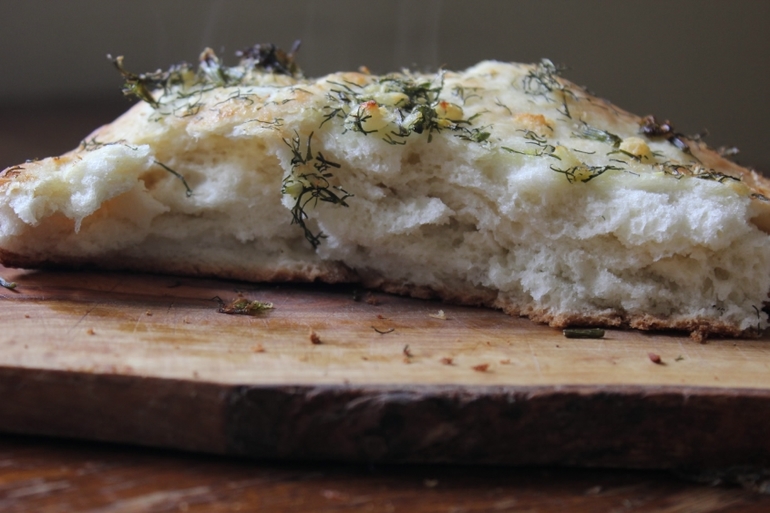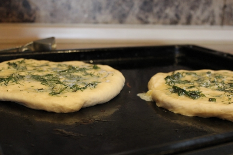 Пальцами сделайте ямки в тесте и смажьте чесночной намазкой, которую вы сделали заранее. Не сделали? Как не сделали? А чем же вы занималтсь два часа? Аа, это я забыла сказать... Ну ничего, вы и сейчас успеете. Растопите 75 г масла, выдавите в него три зубчика чеснока и сыпаните щедрой душой свежего укропа, ну, или замороженного. Если ваш муж как и мой, фанат соленого, присыпьте крупной солью.