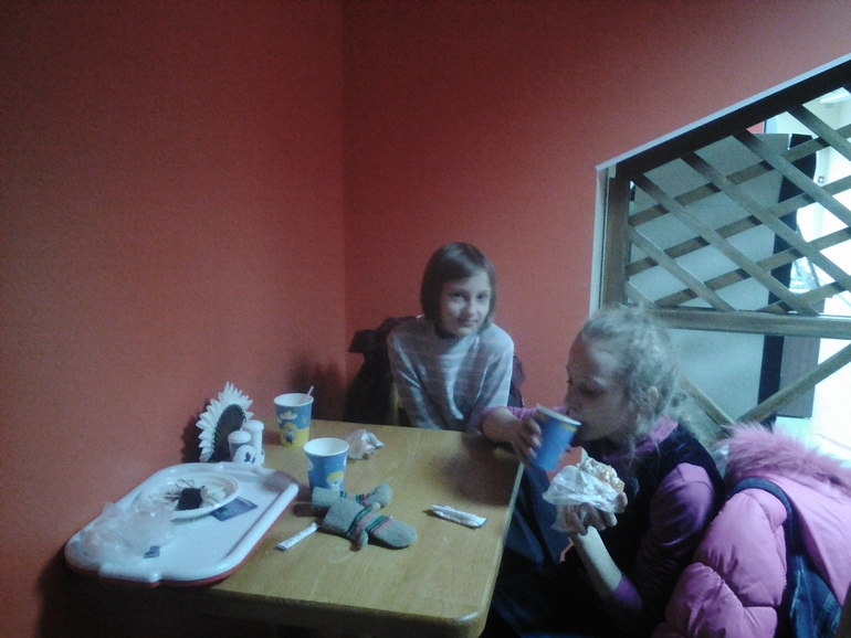 На этих выходных у меня с детьми вышла просто мега удачная прогулка. Во-первых мы довольно быстро нашли дешёвый рюкзак для школы, во-вторых очень удачно зашли в кафе. И не только потому что кафе оказалось тоже очень недорогим и уютным, и выпечка очень вкусная, но и потому что я договорилась с хозяином кафе на роспись стены. Кафе открылось только три недели назад и там ещё не обжито. Но даже в таком виде там было приятно сидеть.