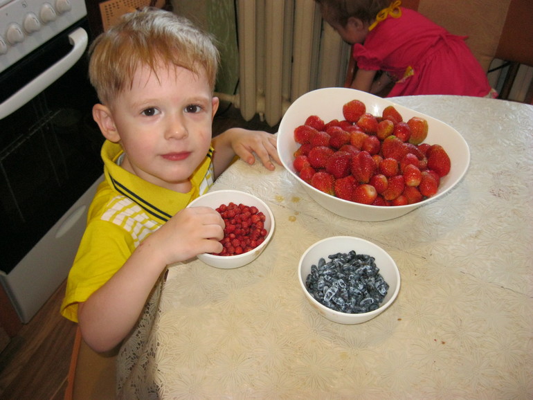 Пройти мимо грядок с клубникой не могли даже когда ее еще не было. Ну а когда они созрели, то утро наше начиналось с собирания ягод в ведерко,которое чаще всего отправлялось вместе с Савкой в садик к ребятам.