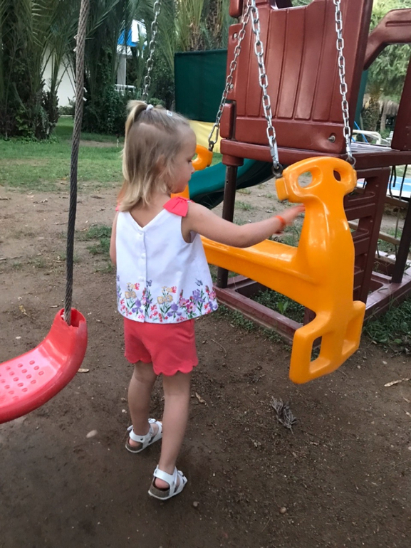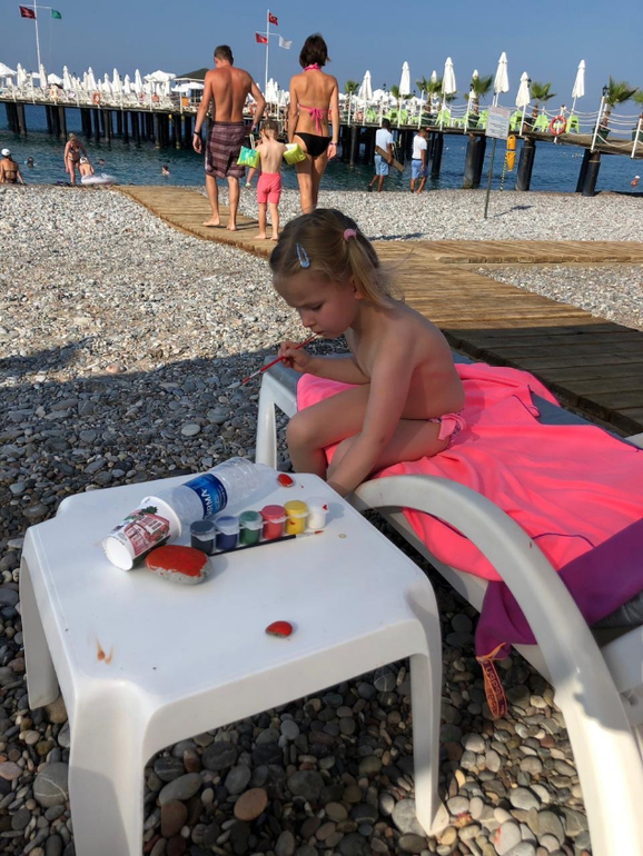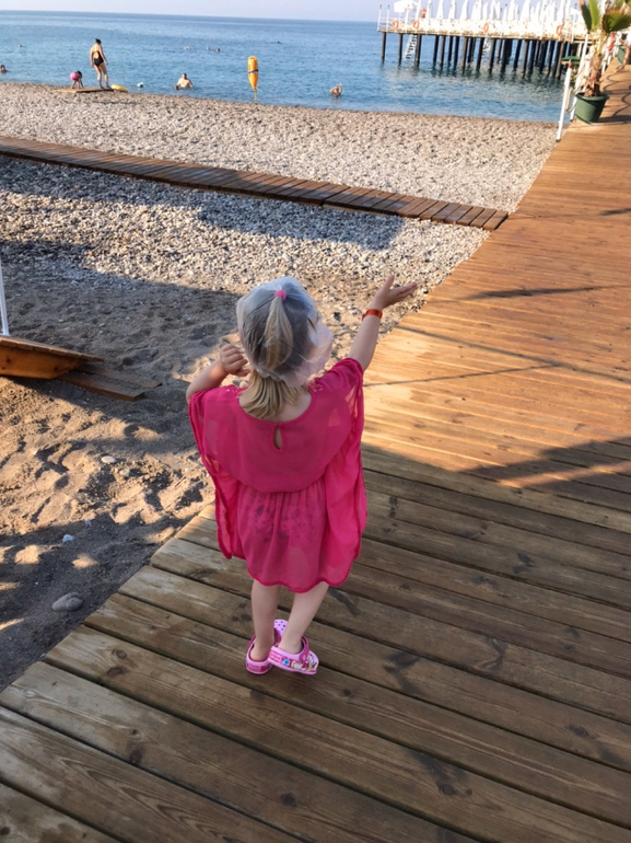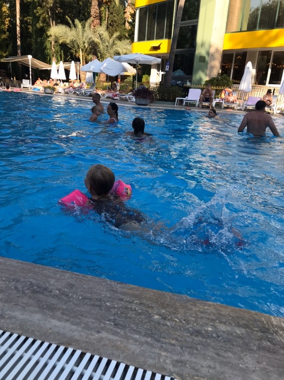Старались первую половину дня проводить на море, а второю в бассейнах, потому как Кира училась плавать с нарукавниками, а в море ей было страшно.