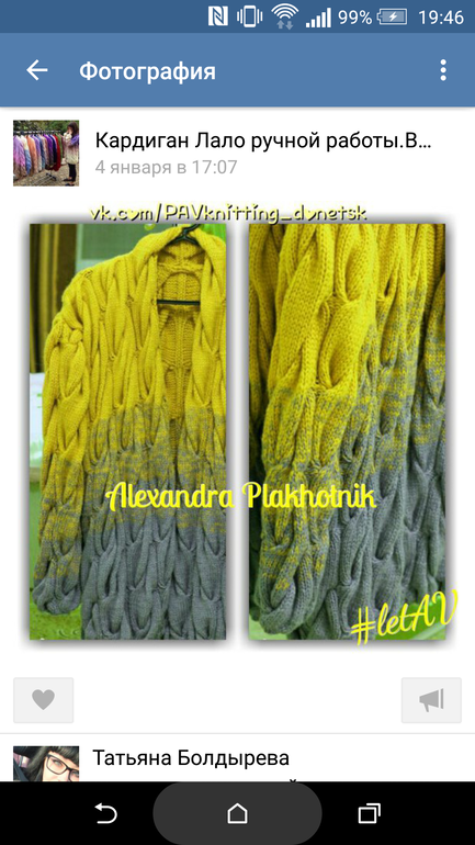 Все началось с того, что мне девушка пишет, что ей одна "вязальщица" предложила связать Лало кардиган и показала свои работы. А потом она наткнулась на меня и поняла, что ей показывали мои работы