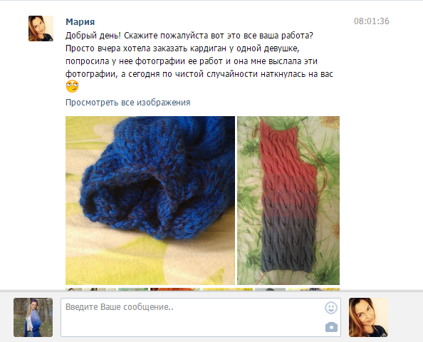 После переписки с руководителям - она показала фото своего свитера, на котором видно, что свитер магазинный - швы и ворот обработан на машинке - точно не ручная работа!