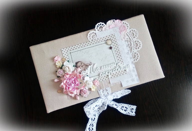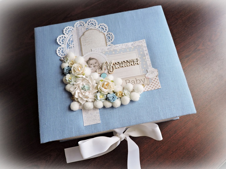 Шкатулка размером 22*19 см, обтянута натуральным льном, завязывается на репсовые ленты. В работе использовала бумагу Наш малыш. Мальчик, чипборд, вырубка, цветочки:
