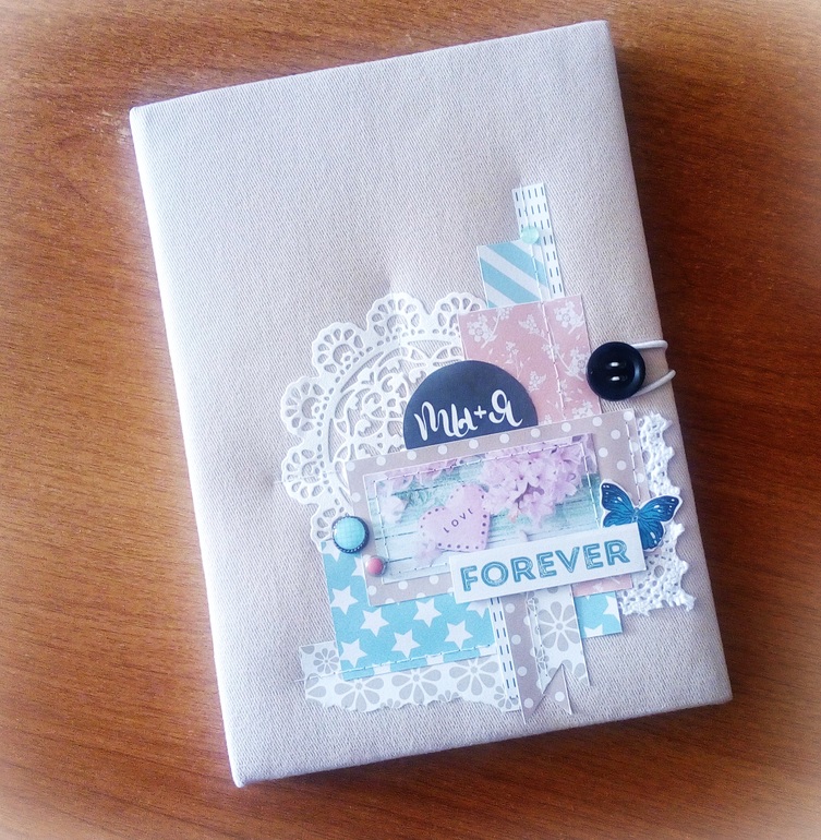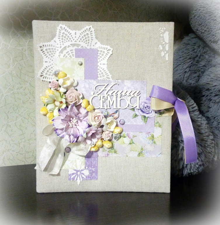 Альбом размером 19*23 см, обложка обтянута натуральным льном, закрывается на репсовые ленты, внутри есть кармашек и конверт для дополнительных фото или памятных мелочей. В работе использованы бумага из коллекцит Счастливый день от Scrapberrys, вырубные салфеточки, цветочки, шебби-ленты, чипборд, брадсы.