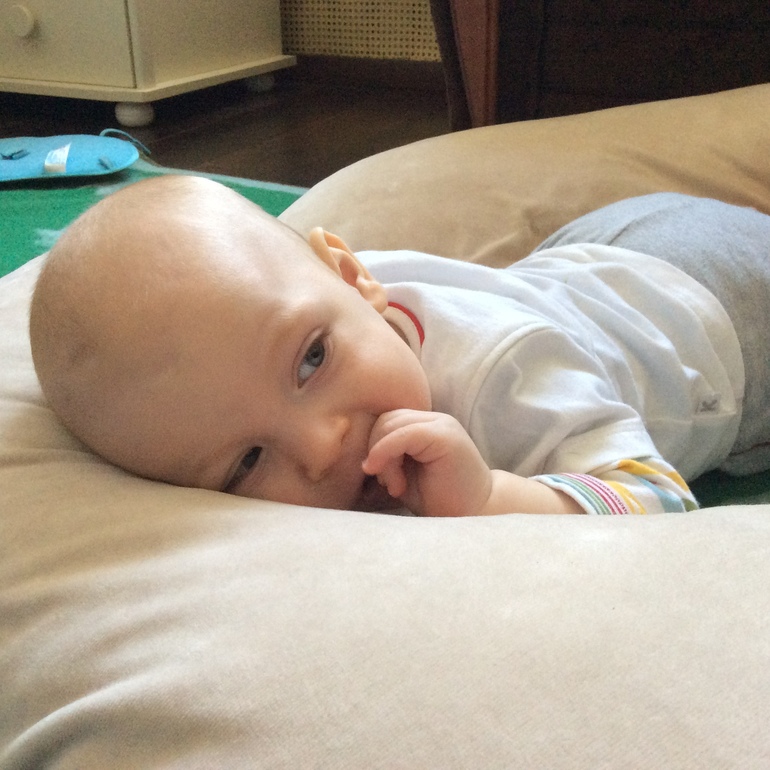 Поскольку мы теперь живём, едим и спим на полу, любит подползти к кормительной подушке и полежать на ней.