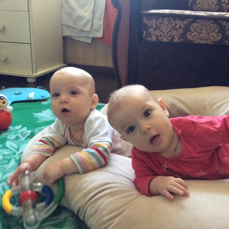 Маришка ползает по пластунски с невероятной скоростью и по всей квартире. Из комнаты доползла за мной в ванну, где я Кирюху подмывала, а однажды и до кухни добралась. Чрезвычайно активная девочка. Если между ними положить игрушку, эта красавица непременно её схватит первой. Лежит напротив брата и хохочет, а он за ней повторяет.