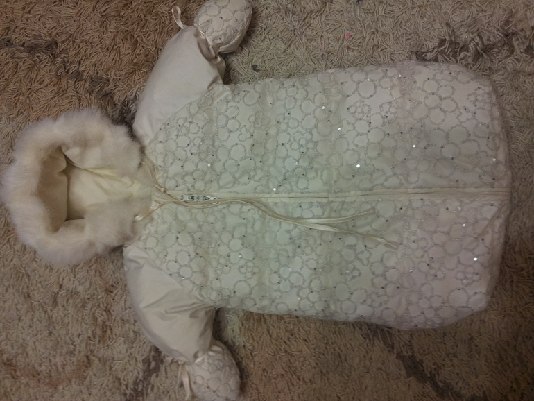 Конвертик ну оччччень теплый,не громоздкий,изящный,благородного цвета.Поддевала флисовый мешочек от Carters,на голову чепчик и шапочку....не мерзли вообще. С прогулки приходили всегда тепленькие. Из роддома также выписывались в этом конверте.конвертик очень красивый и не на один день! по размеру хватит до 4-5 мес.