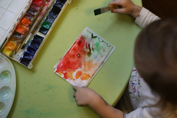Родители часто задают вопрос: «С какого возраста следует приобщать ребенка к искусству?» Это нужно начинать с того момента, когда ребенок уже в состоянии держать в руках или проявляет интерес к таким орудиям труда, как карандаш, мел, кисточка. Мы начали с 10 месяцев). Дочка нравится вот так -На мокром фоне делаем кляксы , помещаем в файл и наблюдаем как смешиваются цвета.