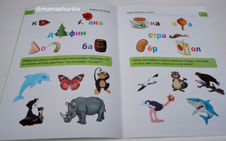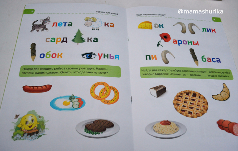 Следующее пособие, это такая тонкая книжечка с ребусами, просто идеально для детей, которые только начинают осваивать ребусы. Очень крупный шрифт и самые простые ребусы, ещё и картинки отгадки есть, просто великолепно!