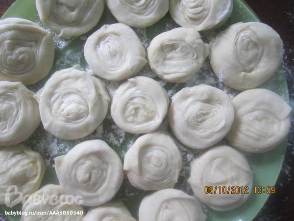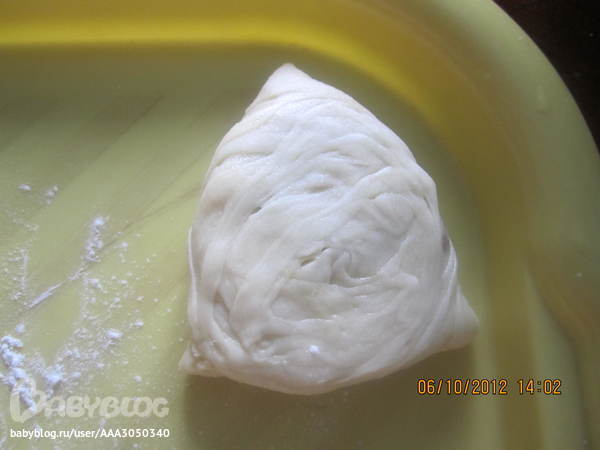 Раскатывает тесто и смазывает растоплнным топлёным маслом.Чем тоньш тем лучше.Далее скручиваем в рулет.