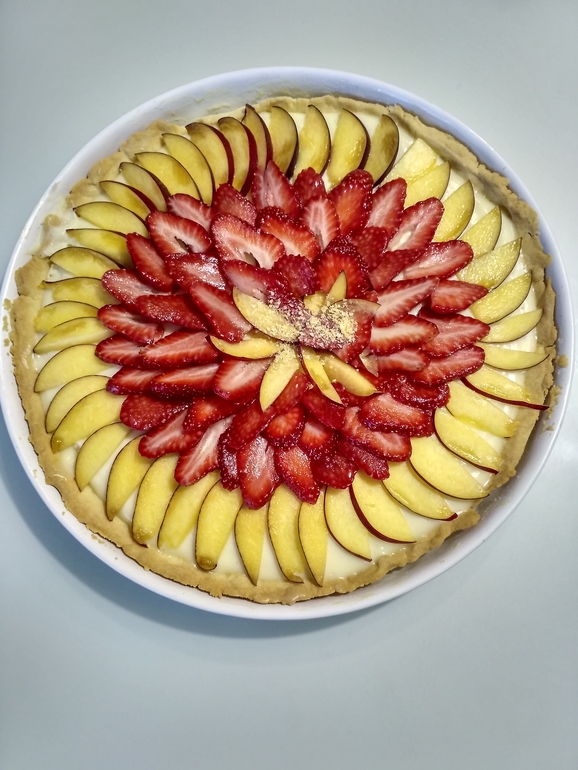 2 яйца, 1 стакан сахара, ванильный сахар, 2 полные столовые ложки муки - всё взбить венчиком
