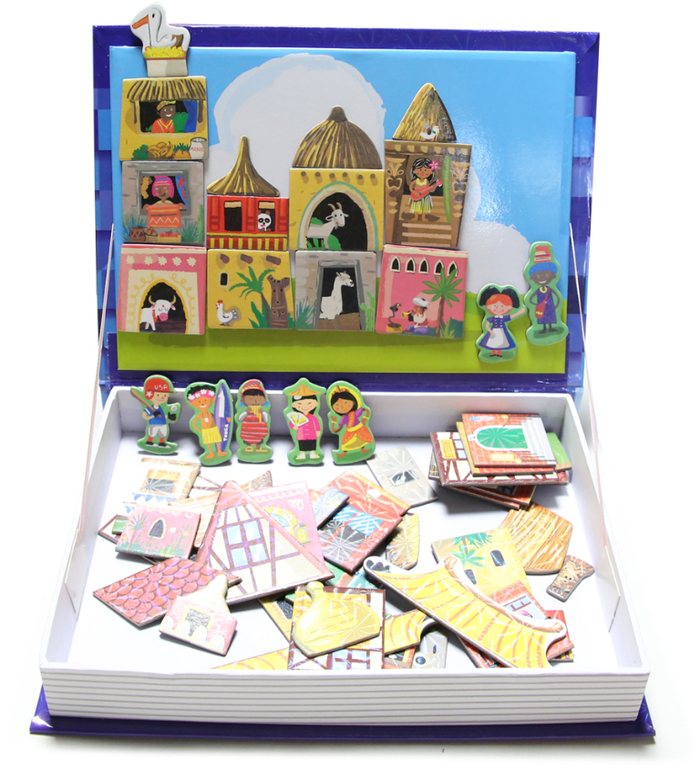 Чемоданчик такой же, доска такая же. Но карточек с домиками меньше, всего 7 шт., хотя деталей и больше. Много мелких деталей типа крыш и украшений. Этот набор более функционален, так как позволяет поговорить не только о разных народах и их жилищах, но и архитектурных элементах типа фахверк, арка, купол, фронтон, портал, крыльцо, ставни.