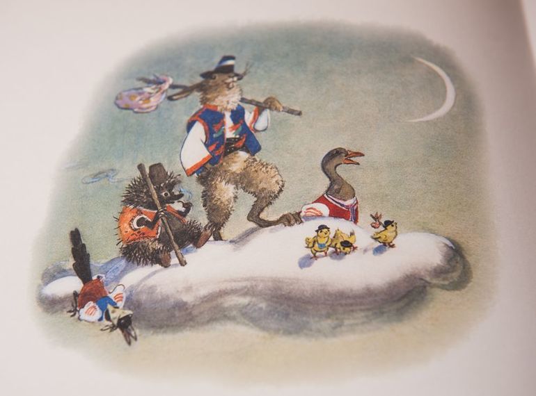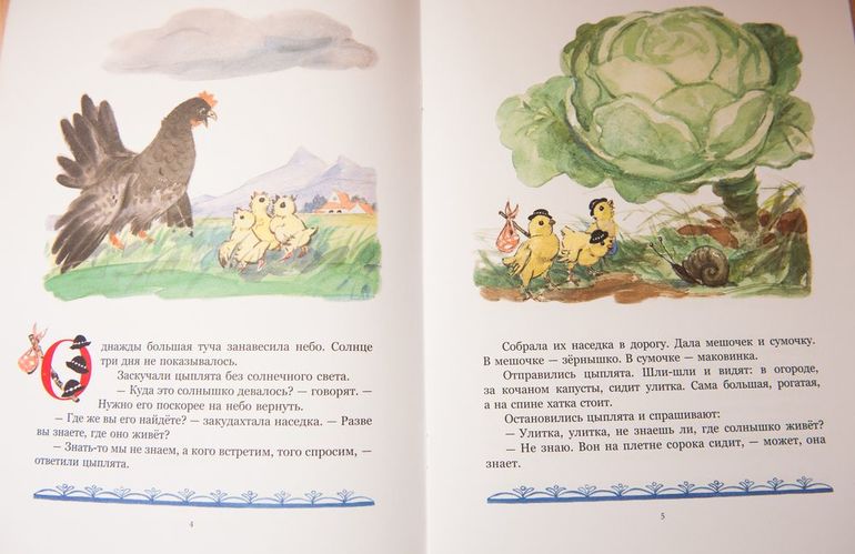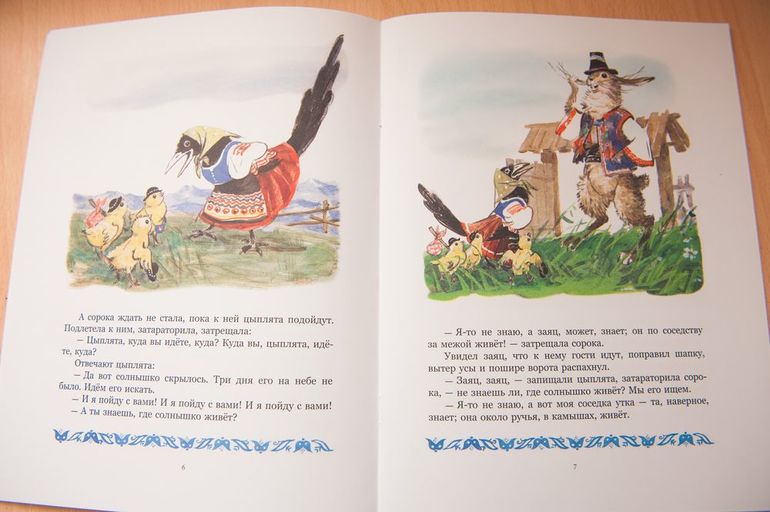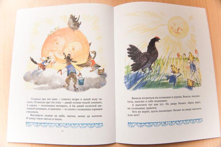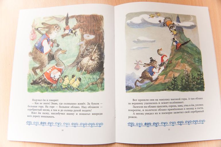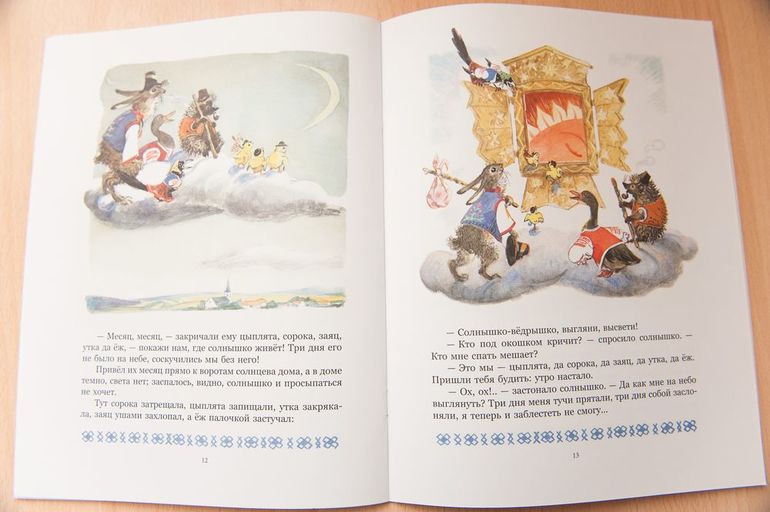 И пятая книжка - словацкая народная сказка "У солнышка в гостях" в обработке С. Могилевской с добрыми иллюстрациями Михаила Карпенко (, , , ). Милая и добрая история о том, как однажды большая туча занавесила небо, солнышко три дня не показывалось. Птицы и звери пошли его искать. Разбудили, умыли - и солнышко засияло вновь.