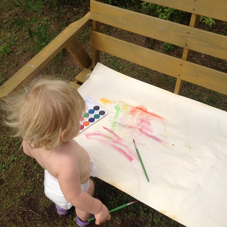 6. Дача отлично подходит для свободного рисования. Кусок старых обоев, краски и вперед. Но у Жанны, как не было, так и нет интереса к любым видам творчества, поэтому я дольше обои отрезала :(