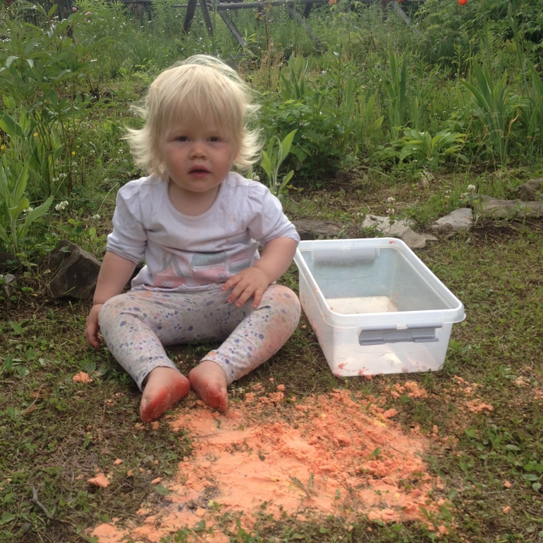 А еще я делала вот такую массу для лепки - смешать 1 стакан пищевой соды с 3 столовыми ложками воды и пищевым красителем, перемешать руками и можно играть, дело 5 минут!