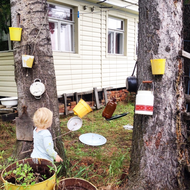 3. Сделали с дедом музыкальную стену из сарайных запасов, чтобы была возможность вволю побуянить и погреметь :)