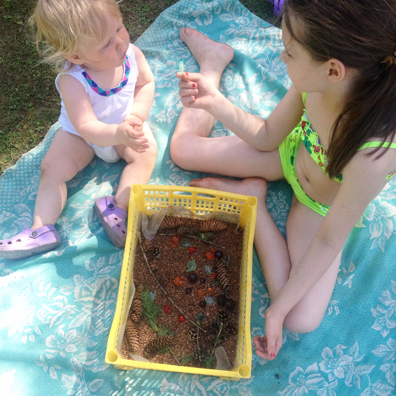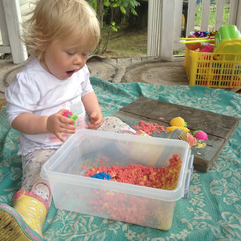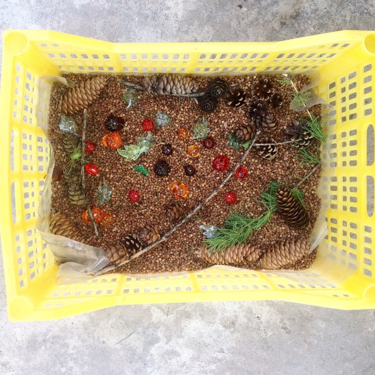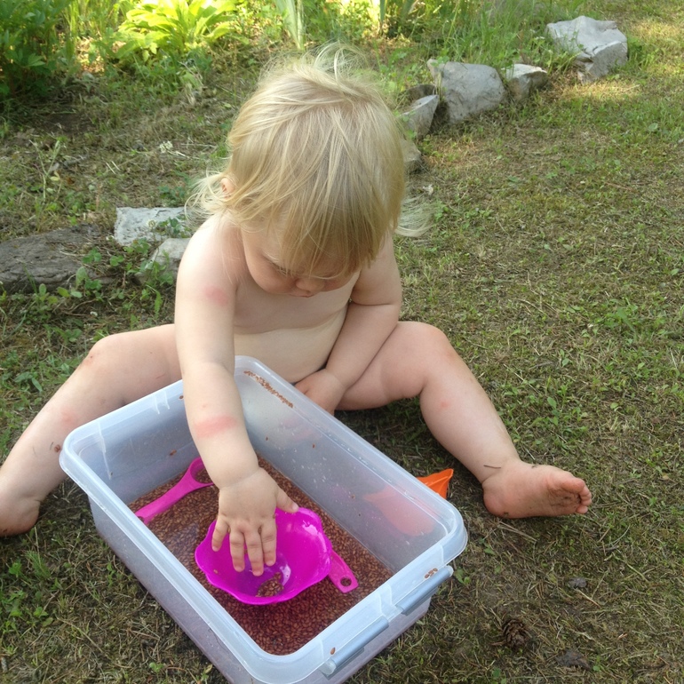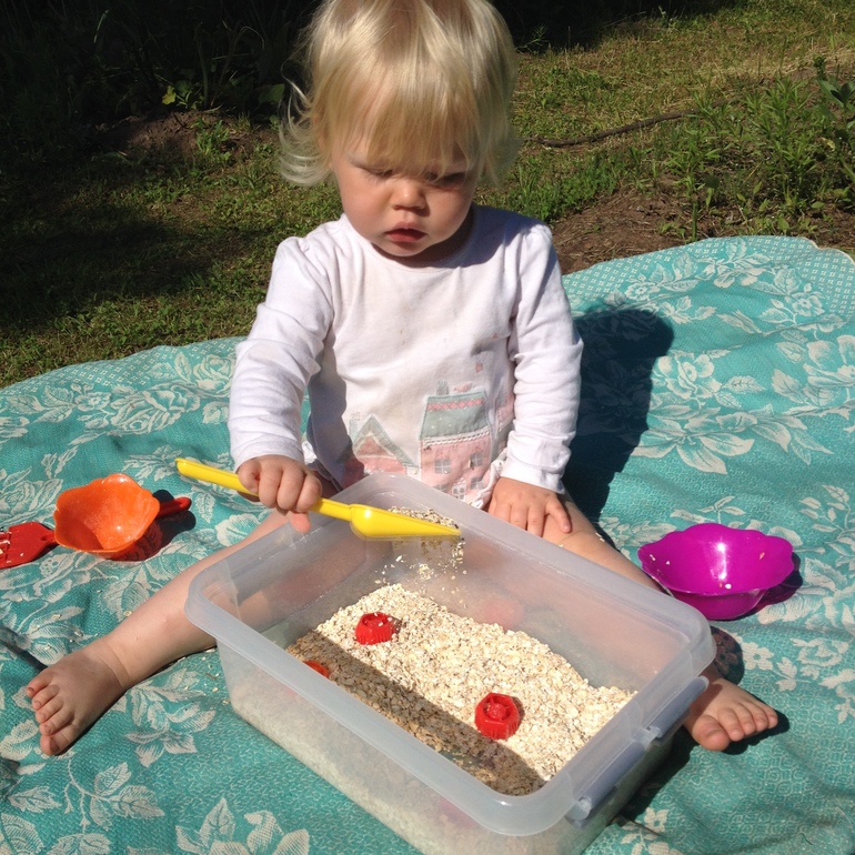 Сначала я просто выдаю контейнер с крупой, потом добавляю лопатки и чашки, потом мелочевку для закапывания, потом что-то необычное типа воронки или фигурок из Киндеров или животных.