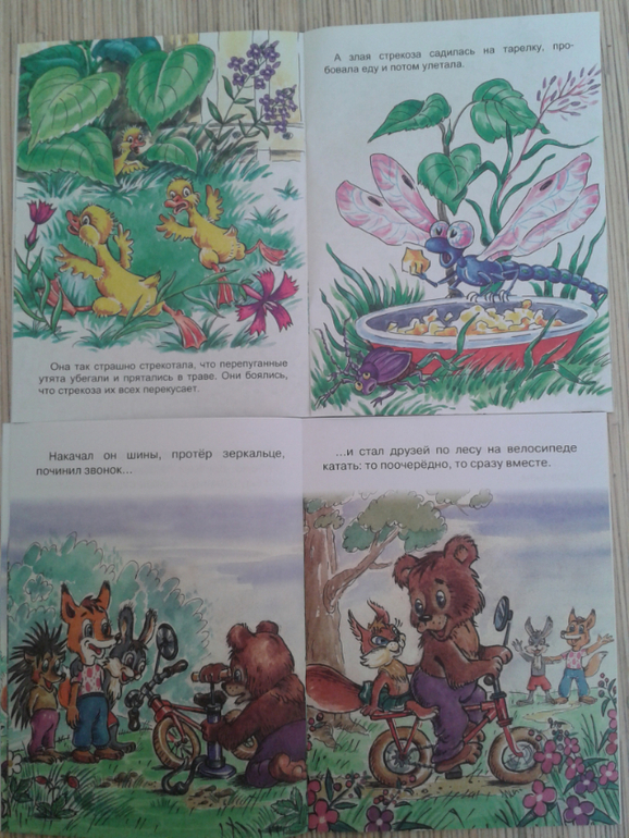 Мишка в крапиве. Лисенку подарили велосипед. Все радовались и помогали кто чем мог: зеркало протерли, колеса надули, звонок прикрутили. Только медведь решил забрать велосипед и уехать на нем за малиной один. Зверята проучили грубияна мишку, указав ему неверный путь к малине. Мишка после падения в овраг с крапивой все осознал и стал хорошим. Много недоговорено в книге. Я добавляю от себя, что никто в лесу (кроме мишки) не умел кататься на велосипеде. А мишка потом не только катал всех желающих, но и научил Лисенка кататься. Иллюстрации приятные, но грязные в некоторых местах. Как будто по сырому рисунку рукой мазанули. В целом неплохая поучительная история.