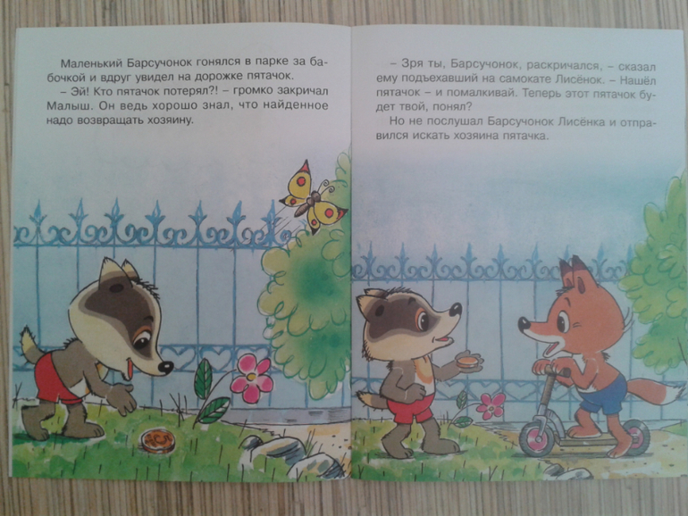 Пятачок. Сказка про честного Барсучка. Он нашел на дороге пятачок и не присвоил себе, а пошел искать хозяина. На пути было много преград: Лисенок советовал оставить деньги себе, волчонок хотел его выменять, а потом попытался отобрать силой, пятачок упал в воду, продавщица-утка соблазняла малыша мороженым..... В итоге нашлась хозяйка - маленькая кошечка, которая не могла уехать домой без денег. Очень добрая история с хорошими иллюстрациями.