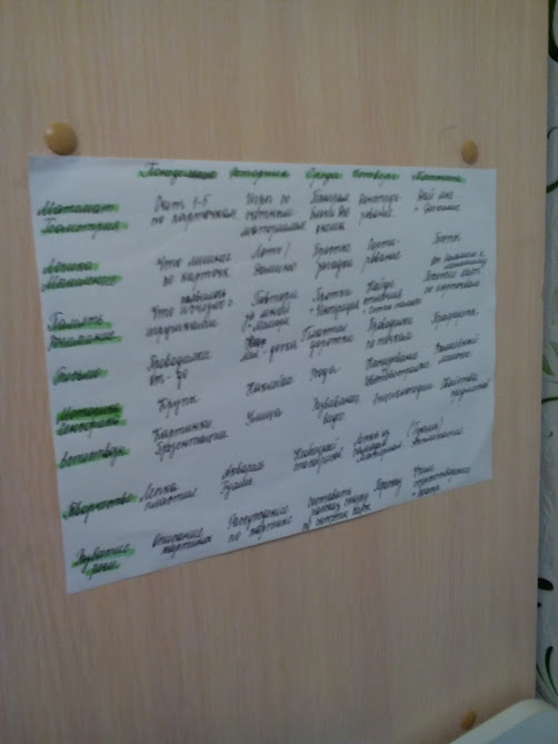 Вот решила показать наш идеальный день в плане развивающих занятий и себя:). После родов долго втягивалась в привычный режим занятий, сейчас, вроде, всё налаживается. Люблю заниматься, когда Игорёша бодрствует, лежит рядом, смотрит, с Вани глаз не сводит:) Я уже писала про нашу систему занятий здесь, сейчас практически ничего не изменилось, только план теперь висит на шкафчике:)